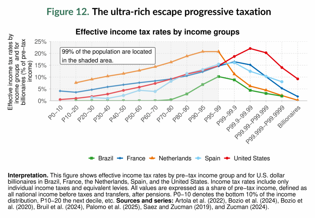 ok internationaal werkt het financiële systeem ongelijkheid in de hand: via rente- en inkomensstromen vloeit jaarlijks circa 1% van het wereldwijde BBP van armere naar rijkere landen. Het rapport concludeert dat ongelijkheid het resultaat is van beleid en dus ook kan worden verminderd, via progressieve belastingen, investeringen in onderwijs en zorg, en klimaatverantwoordelijkheid gekoppeld aan.