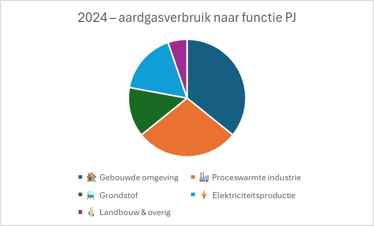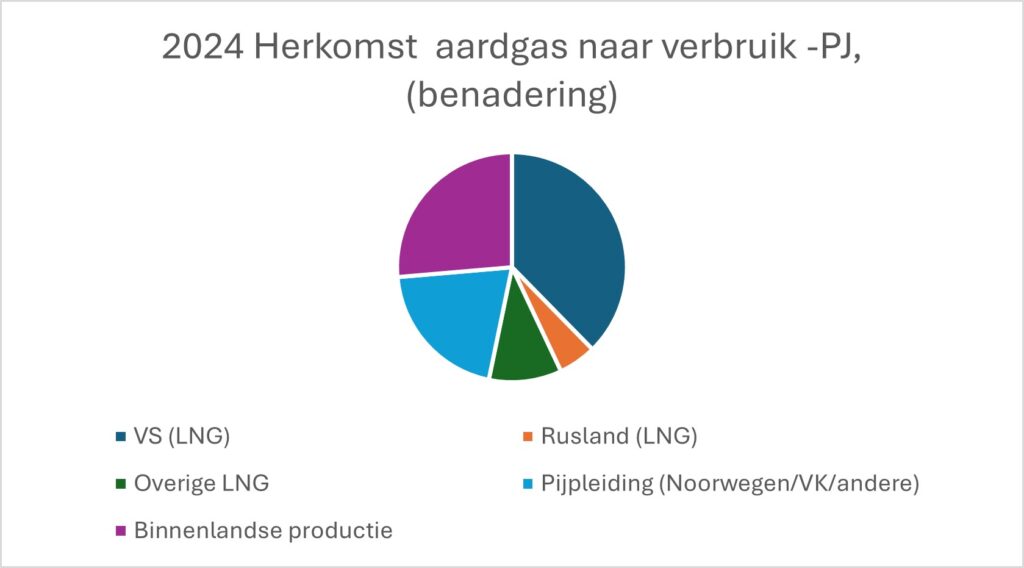Totaal beschikbaar = import + productie ≈ 24,6 – 28 bcm + 9,3 bcm ≈ 33,9–37,3 bcm ≈ 1 073–1 182 PJ. Verbruik = 950 PJ → ~83–89% van totale beschikbaarheid